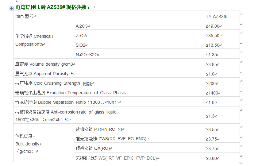 AZS36是熔鑄AZS系列產品中性能優異的產品,具有較高的抗玻璃液侵蝕性能和低污染特性,通常使用在玻璃熔爐熔化池熱點附近的池壁等關鍵部位。