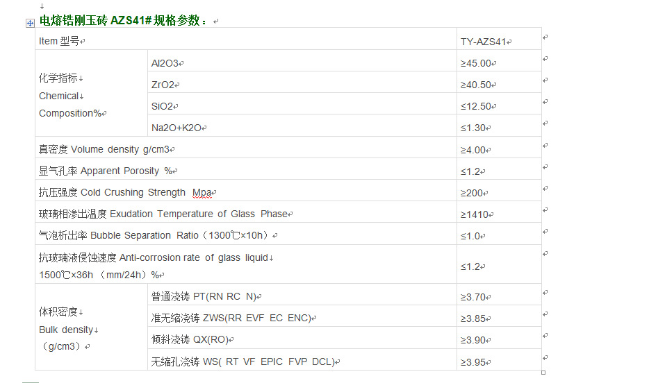 AZS41是熔鑄AZS系列產品中性能最優異的產品,具有極高的抗玻璃液侵蝕性能和極高玻璃相滲出溫度的特性,對玻璃液的污染極低。廣泛地使用在玻璃窯爐熱點處的池壁、投料口拐角、流液洞、窯坎、池底鼓泡和全電熔窯等關鍵部位。