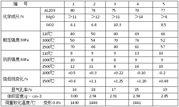 超微粉結合鋁鎂尖晶石質耐火澆注料用的耐火骨希饕巧轎魈丶斗潦熗希珹L2O3與TiO2合量約為90%,臨界粒徑約為25mm,一般采用連續顆粒級配,也有用間斷級配的:結合劑為活性SiO2超微粉,SiO2大于91%,中直徑D5O約為3μm,另加聚磷酸鈉等分散劑和快干劑。其性能見(下表)。基質中均加較高檔次的鋁鎂尖晶石粉、剛玉粉和α-AL2O3超微粉。表中編號1添加電熔鎂砂粉,用量約為9%:編號2添加高純鎂砂粉,編號4添加MgO約為94%的燒結鎂砂粉,編號3、編號5和編號6則為中檔鎂砂粉。其細度均不大于0.088mm。 (表)超微粉結合鋁鎂MA質澆注料的性能 從表中看出,μf-SiO2結合鋁鎂尖晶石質耐火澆注料的性能較好,烘干強度高,高,中溫強度適當,其強度比在0.7~1.4之間,是較小的。因此該料康熱震穩定性較好,抗剝落性好:同事,體積密度較大。顯氣孔率小,即料較致密。1500℃燒后線變化均為正值,呈膨脹狀態,也有利于抗熱剝落性。 超微粉結合鋁鎂尖晶石質耐火澆注料的性能優良,主要在中小型鋼包上應用,取得了滿意的效果。與高技術鋼包耐火澆注料相比,耐火骨料、鎂砂和鎂鋁尖晶石等材料的檔次略低些,因此基質組成材料對超微粉耐火澆注料的性能影響,也有所不同。耐火澆注料的耐火骨料為AL2O3大于83%的特級礬土熟料和MgO大于95%的中檔鎂砂,臨界粒徑分別為10mm和3mm,總用量約為70%:耐火粉料為AL2O3>65% 和MgO>24%的鋁鎂尖晶石粉、鎂砂粉、,特級礬土熟料粉和SiO2超微粉等,其合量為30%左右。在澆注料基質中,固定鋁鎂尖晶石和中檔鎂砂的用量,調整SiO2超微粉和高鋁粉的用量,并確保合量約為30%。μf-SiO2用量為1a~5a時,其基質組成中相對應點的SiO2含量分別約為:6.2%、9.3%、12.5%、16.0%和19.1%,其m(MgO)/m(AL2O3)分別為0.64%、0.68%、0.72%、0.77%和0.83%。隨著μf-SiO2用量的增加,烘干耐壓強度顯著增加,1500℃燒后耐壓強度變化和顯氣孔率,則不斷降低。。所以,用μf-SiO2做鋁鎂尖晶石質耐火澆注料結合劑,應選擇最佳的用量約為2a,以確保其基質組成獲得高性能的耐火澆注料。