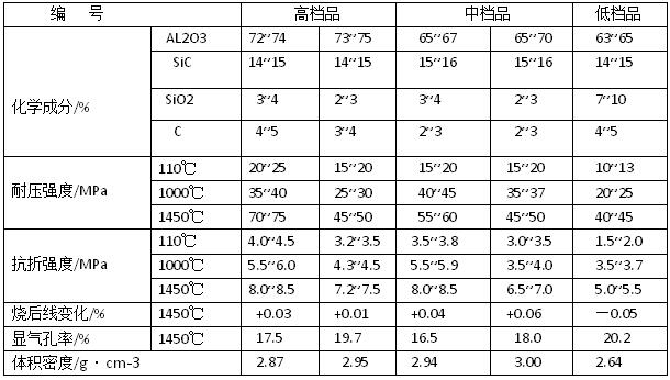 我國高爐出鐵溝過去一般用粘土熟料、焦粒、軟質粘土和焦油瀝青搗制而成,通鐵量少,修補頻繁,勞動強度大,污染環境:后來,采用AL2O3-SiC-C質搗打料,通鐵量顯著提高,但勞動強度大:到后來開發了AL2O3-SiC-C質超低水泥耐火澆注料。該類澆注料一般用致密白剛玉、亞白剛玉、棕剛玉、優質高鋁熟料、碳化硅和鱗片石墨等材料,再摻加超微粉、結合劑和外加劑配制而成。其性能(見下表)表中,高中檔產品適用于大、中型高爐出鐵溝,中低檔產品則適用于中、小型高爐出鐵溝或渣溝。