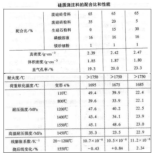 在配置硅質(zhì)耐火澆注料時(shí),主要用燒成硅磚或硅石,而生硅石和硅石粉用量不能太多。因?yàn)闊缶€膨脹較大,影響澆注料的高溫性能。(以下表)為硅質(zhì)澆注料的配合比和性能。耐火骨料的顆粒級(jí)配為6~3mm,23% 3~1㎜,32%,1~0.5㎜,15%,0.5~0.1mm,30%:耐火粉料細(xì)度為小于0.09㎜:磷酸濃度為50%:鎂砂粉的細(xì)度為小于0.09㎜。